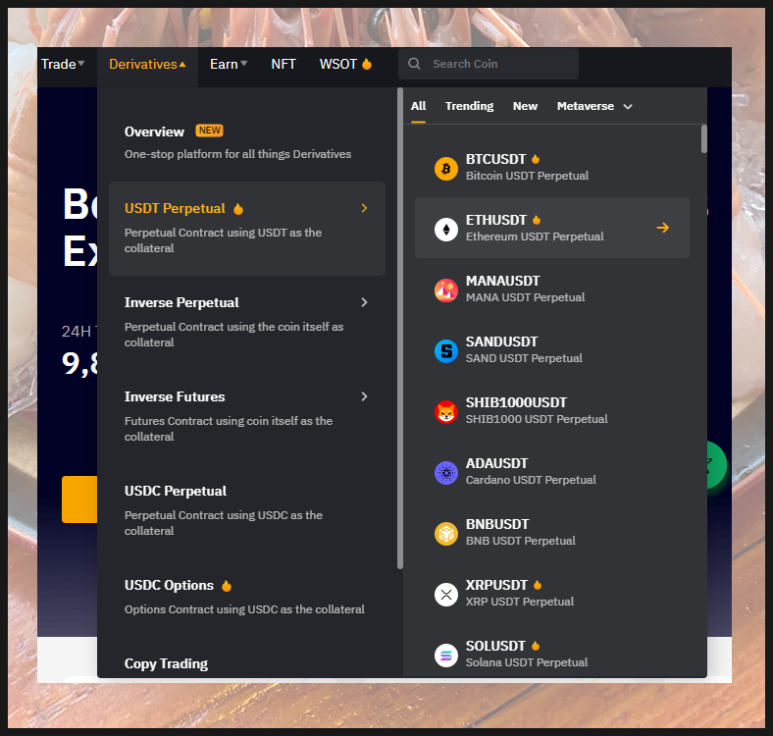 이후 이비트의 왼쪽 상단에 있는 Derivatives를 눌러주시고, USDT Perpetual -> 거래할 종목을 선택해주시면 됩니다.